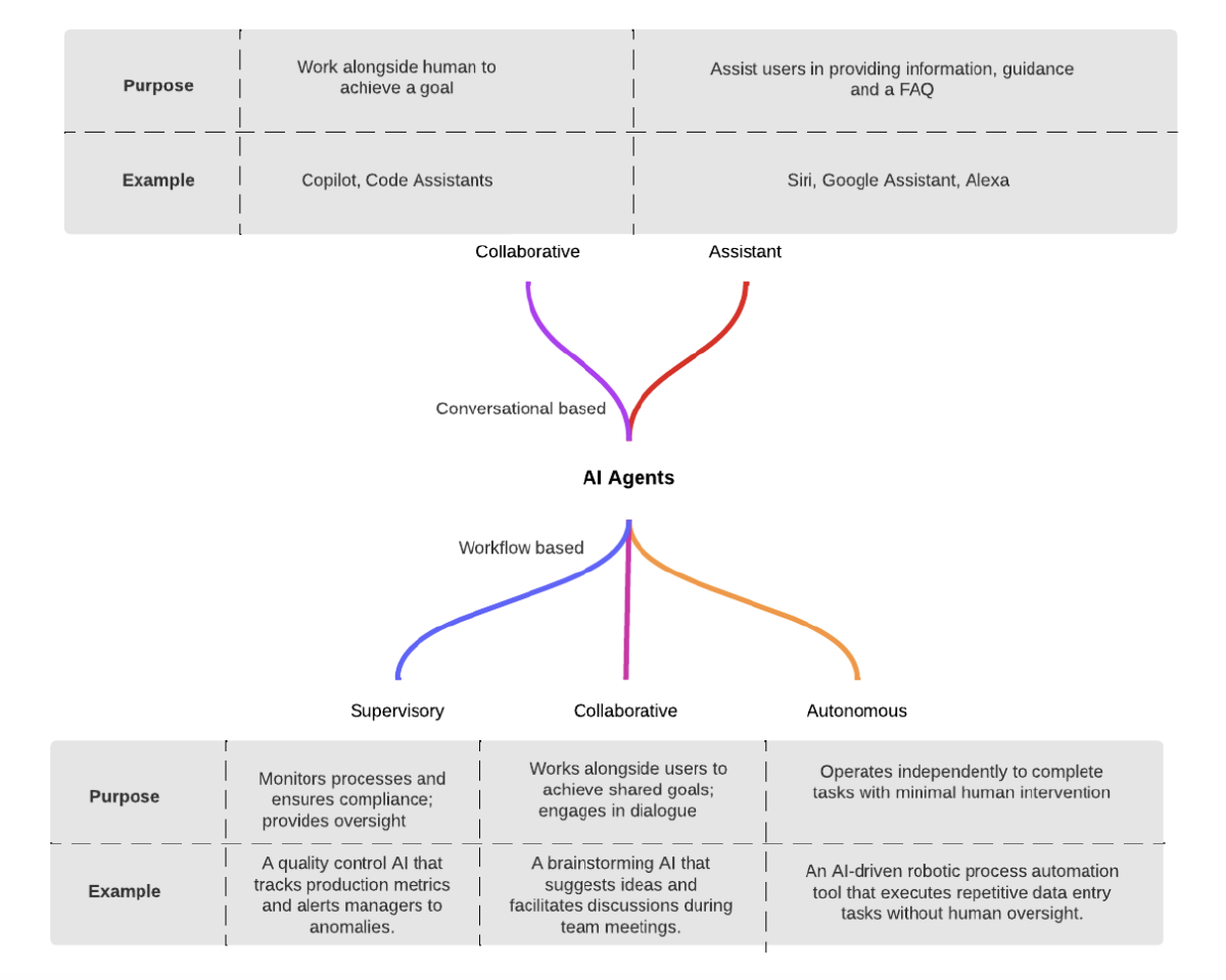 In an Enterprise, we see a few types of agents based on the surface. Some of these are based on conversational just as we mentioned above. and some of these are based on workflow orchestration. We classify the agents based on the surface as below Conversational Agents (Collaborative Agents and Assistive Agents) Workflow Orchestration Agents (Supervisory, Collaborative and Autonomous)