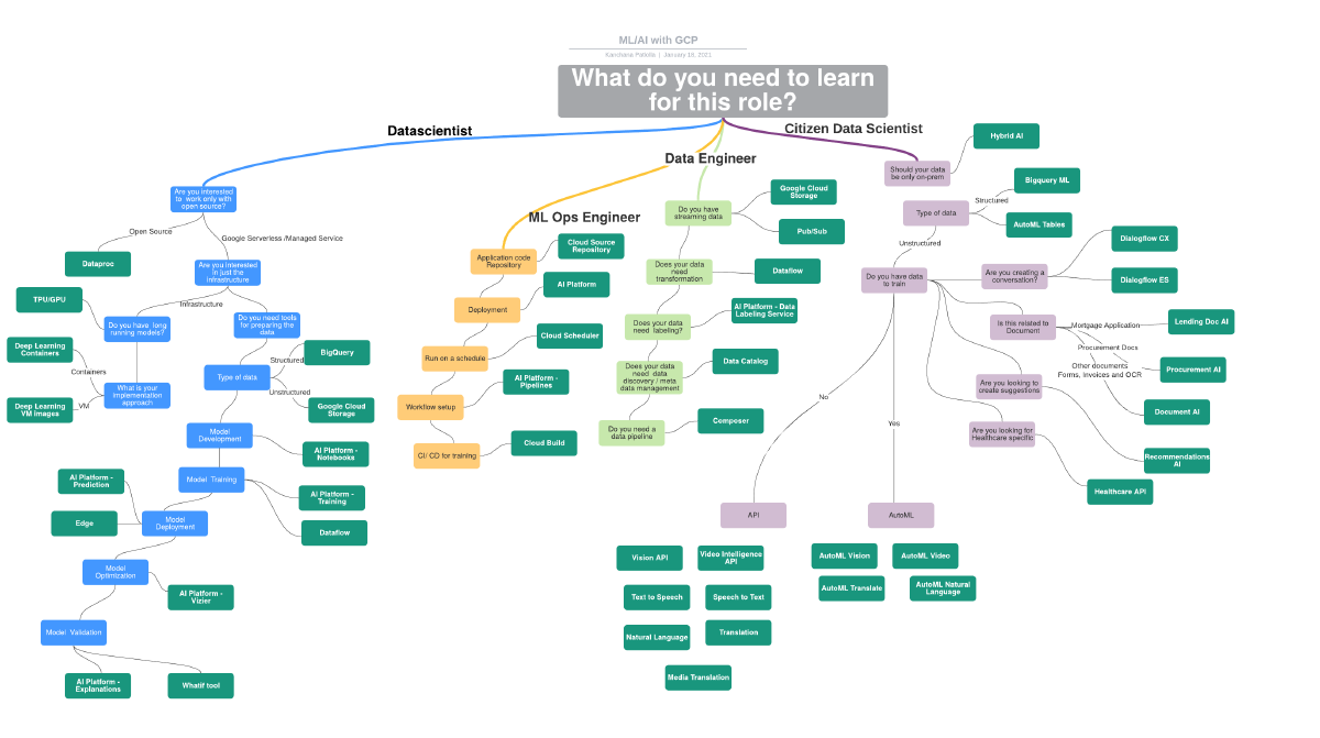 We saw above the key roles in an AI org and the relevant services available in Google Cloud enabling you to leverage and accelerate your learning and implementation